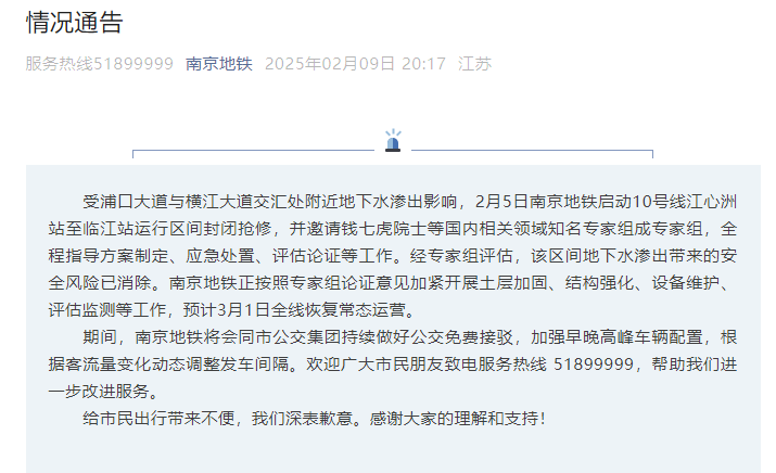 受浦口大路与横江大路交织处近邻地下水渗出影响,2月5日南京地铁启动10号线江心洲站至临江站启动区间紧闭抢修,并邀请钱七虎院士等国内关连鸿沟闻明大众构成大众组,全程教诲有缠绵制定、济急贬责、评估论证等责任。经大众组评估,该区间地下水渗出带来的安全风险已放手。南京地铁正按照大众组论证主张加紧开展土层加固、结构强化、斥地珍爱、评估监测等责任,瞻望3月1日全线收复常态运营。
