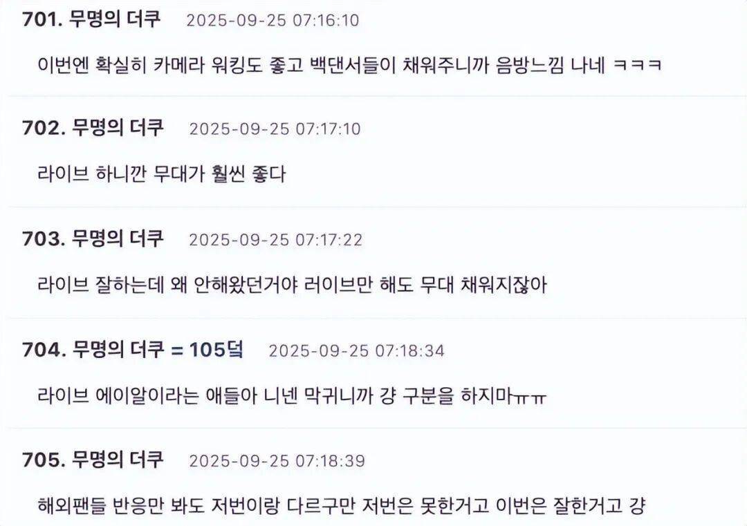 对比此前被批“迷糊”的《晨安好意思国》舞台,这次粉丝和路东说念主的评价实在一边倒:“这次镜头调遣更好,伴舞也撑满了舞台,看起来如实像音乐打歌节目”、“她们很擅长真唱,为什么之前一直不这样作念呢?光靠真唱就能撑住舞台”,以至有网友径直回怼质疑预录的声浪:“那些宣称是预录现场音源的东说念主,你们听力不好就别硬分裂了”、“光是看外洋粉丝的响应就能知说念,这次和前次实足不相同。前次很差,这次很好,就这样陋劣”。