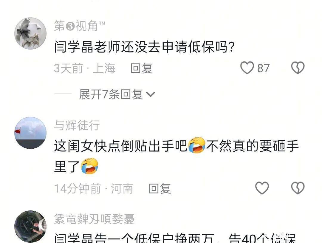 有东说念主问冯巩怎样看闫学晶哭穷卖惨的事,还有东说念主找他借款,说我方孩子一年花不到100万,合计都不够用;还有东说念主提倡让闫学晶去告低保户,说一个低保户能挣2万,40个这么的东说念主就能赚80万了!