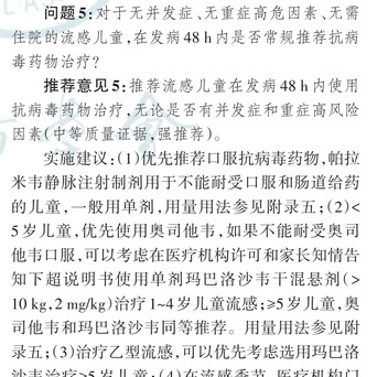 根据2024版的《儿童流行性伤风疫苗精细和抗病毒药物应用的实施指南》(图6),对于儿童流感患者岂论是否有并发症和重症高危因素,在发病48小时内王人推选使用抗病毒药物: